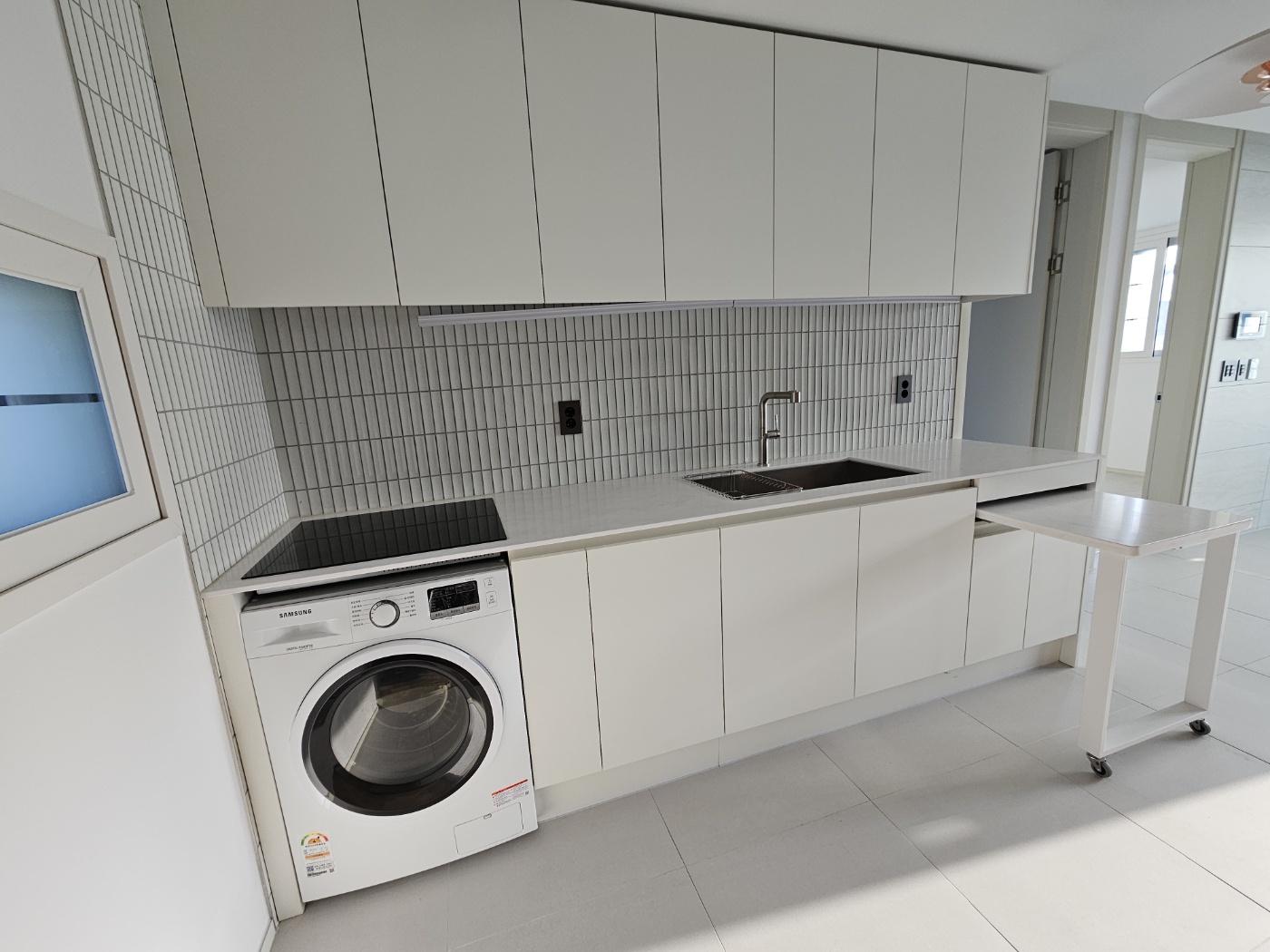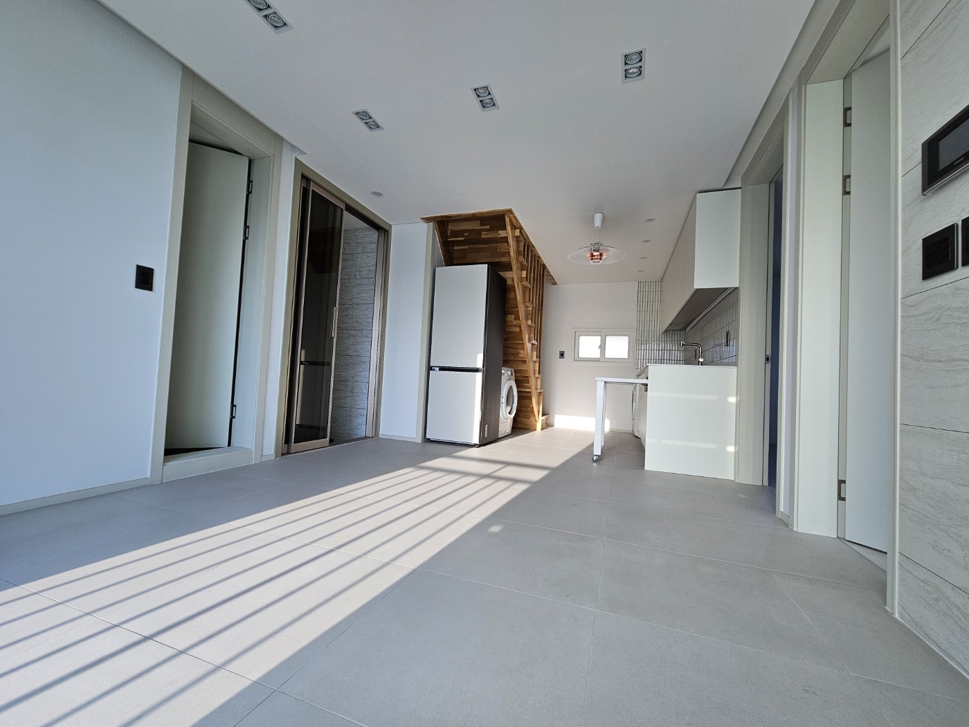 복층으로 올라가는 길목에 위치해 있는 주방은 하얀색으로 모던함을 더했고 상부장 하부장이 있어서 그릇이나 냄비들은 나누어서 수납하기에 충분합니다