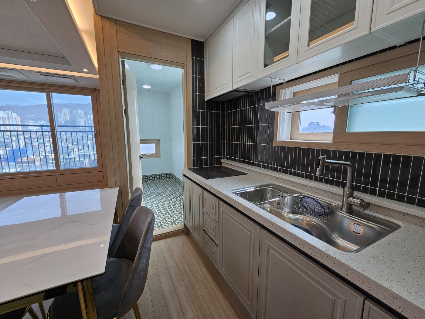 ㄱ자 주방 형식으로 주방 옆으로 다용도 실도 갖추고 있어서 주방짐이 많으셔도 걱정 하실 필요가 없습니다. 상하부장과 수납장 스타일이 다양하게 있어서 수납하기에 안성맞춤이 주방입니다.