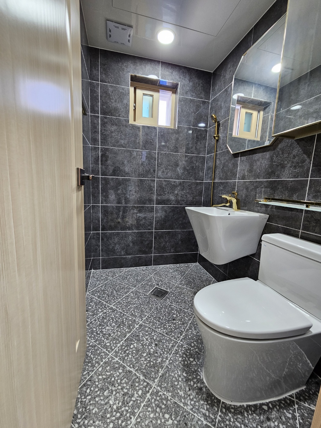 타일이나 벽면 거울등등 디자인에 많이 신경쓴듯한 화장실입니다. 이곳 화장실 역시 금색 수전으로 세련됨을 연출했습니다.
